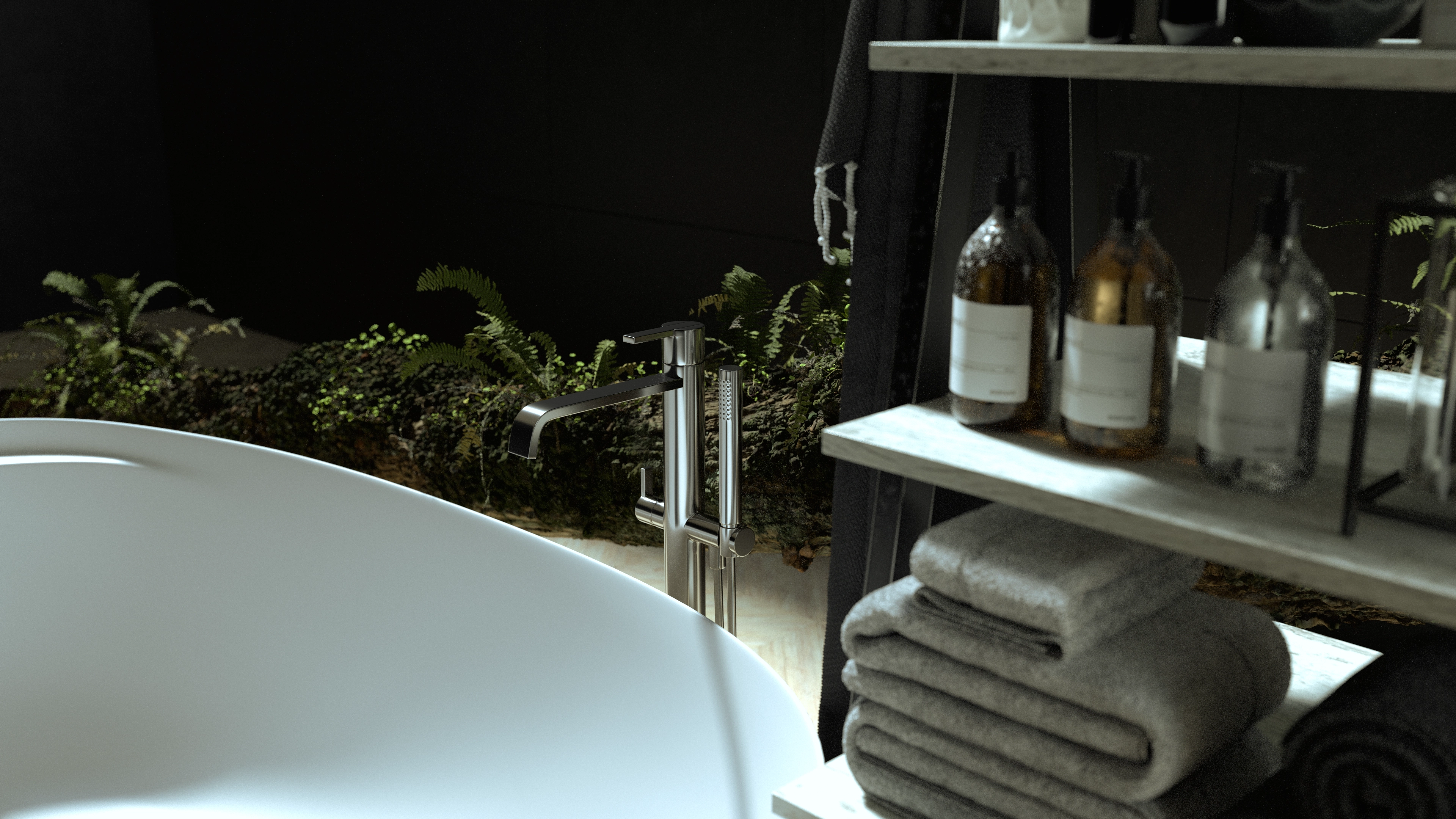 Retreat 01: Earth-Inspired elegance. Every detail in this bathroom is a study in contrasts, where the raw beauty of nature meets the refined sophistication of contemporary design. The freestanding bathtub, with its pristine white surface and organic curves, becomes the visual anchor of the space, embodying purity and simplicity. Its smooth, sculptural form is a striking juxtaposition against the deep, moody backdrop, where dark walls create an immersive, cocoon-like ambiance. The intentional interplay between light and materiality adds depth and dimension. Soft, diffused lighting accentuates the rich textures of the natural elements, from the lush green ferns to the rugged, moss-covered tree trunk that appears to have been seamlessly integrated into the architecture. The subdued, almost theatrical lighting creates an atmosphere that is both dramatic and calming, evoking the quiet serenity of a forest retreat. Concept render done in Maxon Cinema 4D, Otoy Octane Render and Quixel Megascans.