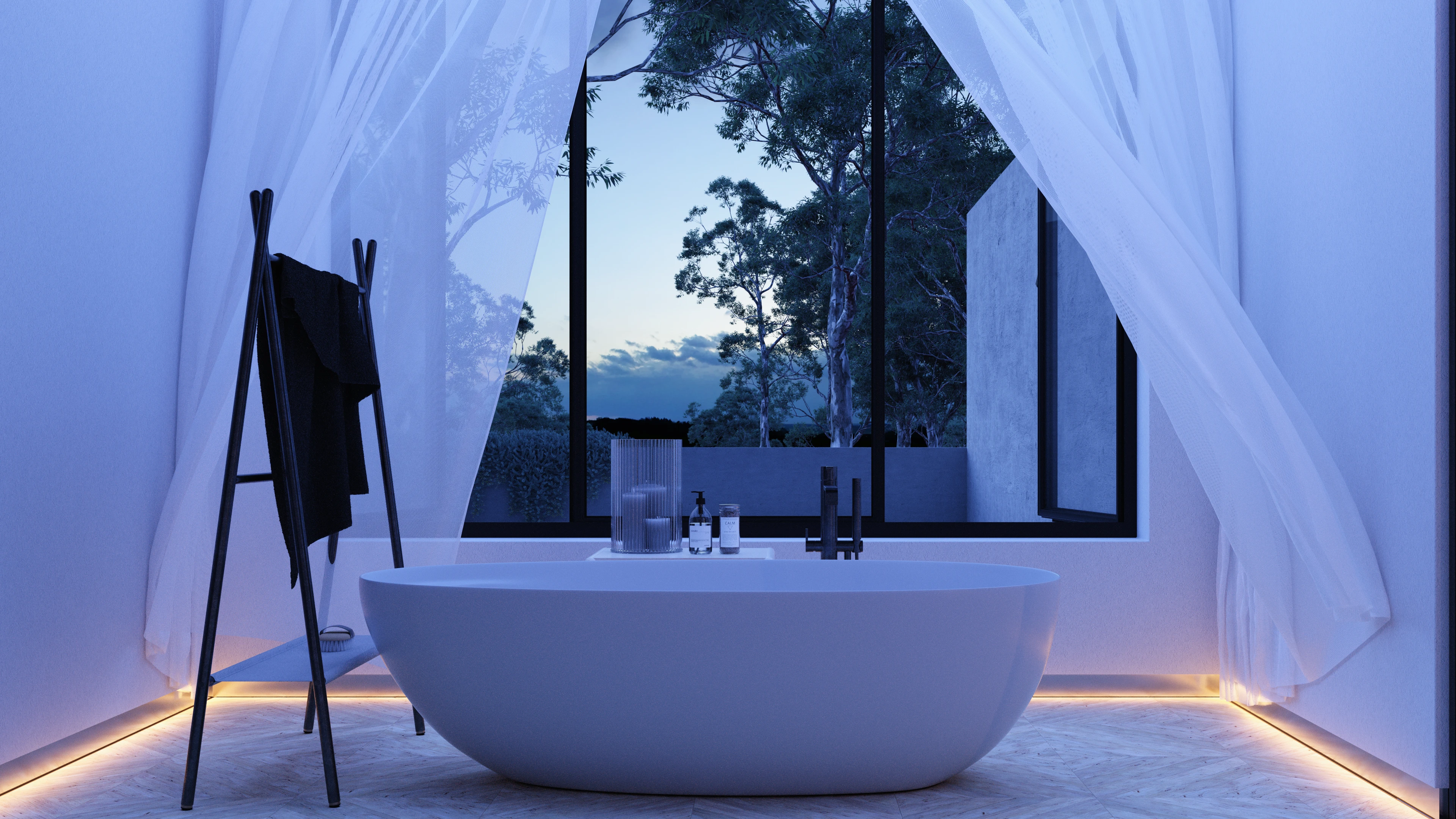 Sculpted by Nature: A Sanctuary of stone, light, and minimalism; where raw beauty meets modern refinement, for an escape rooted in nature. A concept render focusing on the intricate interplay of light and the environment, and the ever-shifting daylight temperatures from a bright mid-morning to the subdued hues of the evening. The style embraces and emphasizes the arid and rugged environment of a temperate highveld (Prairie) grasslands where a savanna and shrub-lands biome converge. In the background tall eucalyptus trees lining the view and horizon. Contrasting to many concept renders of this type, this visualization project features drier and hadier features, as opposed to the usually lush green visuals. Created in Maxon Cinema 4D, Otoy Octane Render using Quixel Megascans with Bridge. Background plates, environments and HDRIs from Poly Haven.